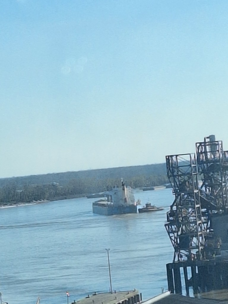 There are lots of boats and barges on the Mississippi River: