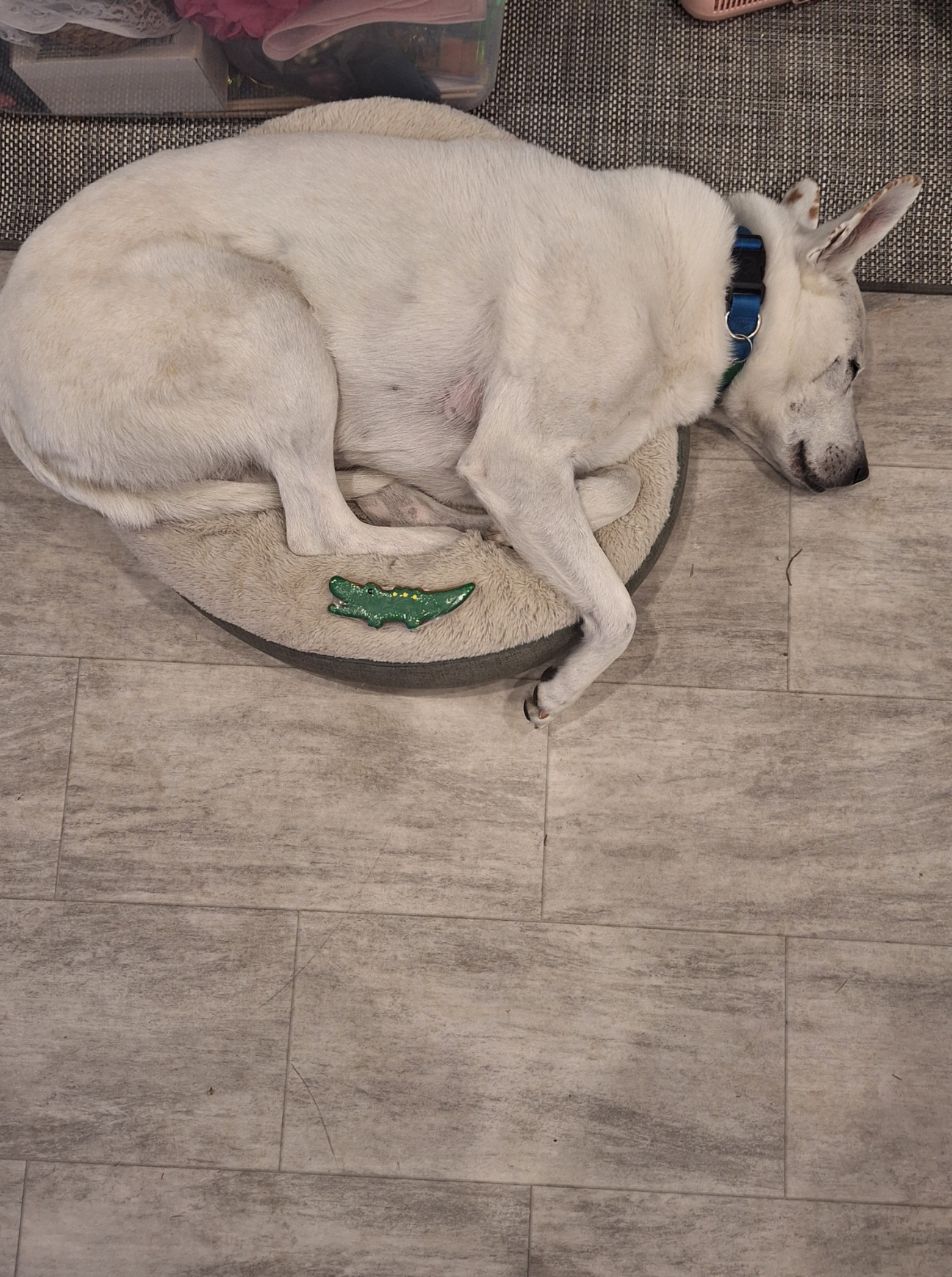 Next is our baby boy, Tristan. He is eleven years old and we’ve had him since he was around one year. He is a white German Shepherd mix: