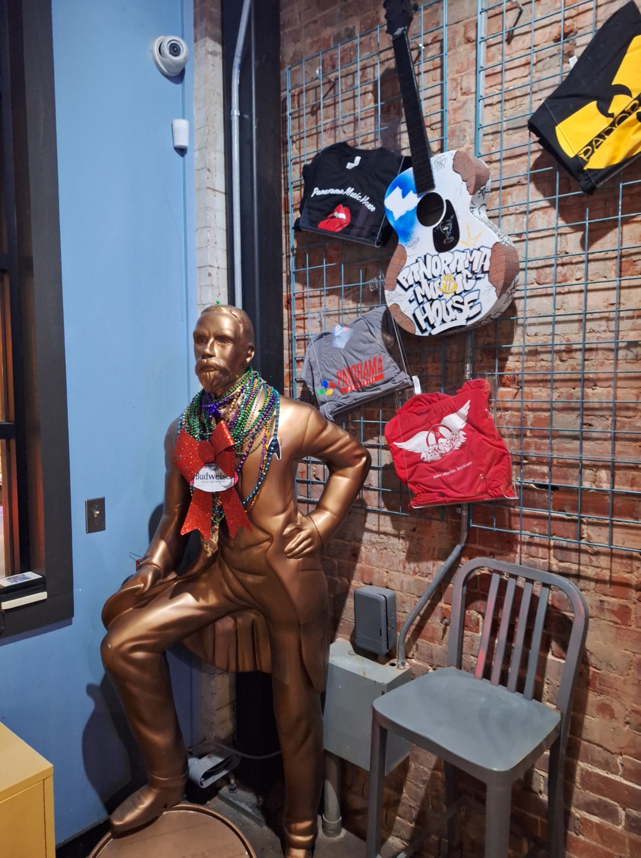 Louisiana wasn’t just about Mardi Gras for us. Jay is a jazz man. I am a rock and roll gal who also grew up listening to country, but I like all genres of music. I thank my oldest brother, Kevin, for introducing me to so many different kinds of music. Jay has learned to enjoy most of what I listen to. We knew Louisiana had a lot of live music, and we were sure to find some locations. On our first night, we went to Panorama Music House. While the music was great, the food wasn’t much to speak of unless perhaps you like seafood. I, unfortunately, do not. This group was called Street Side Jazz Band. The Panorama entrance is fun and filled with some memorabilia, as are the walls inside where the stage and tables are. Of course, the statute has Mardi Gras beads on it!