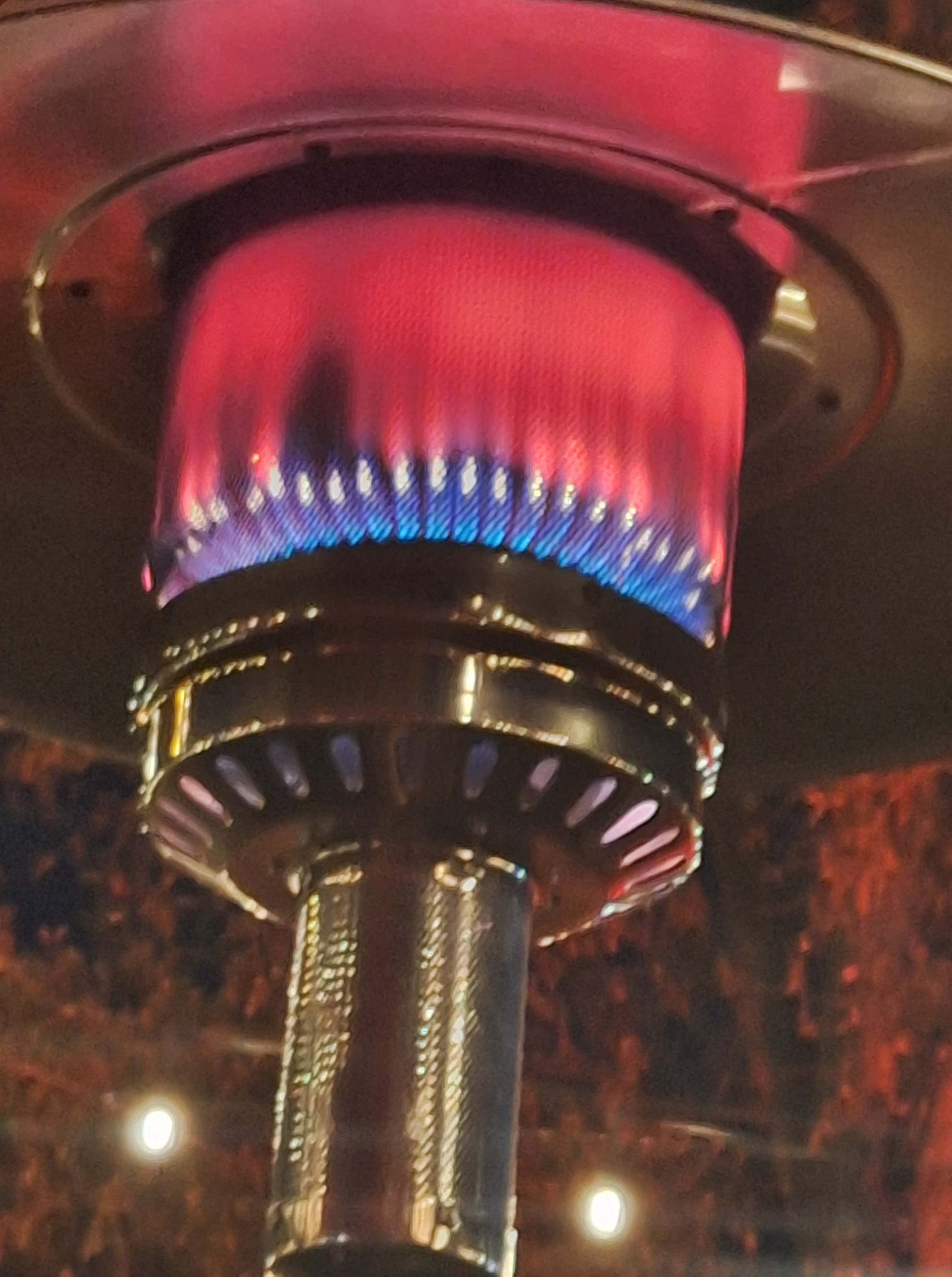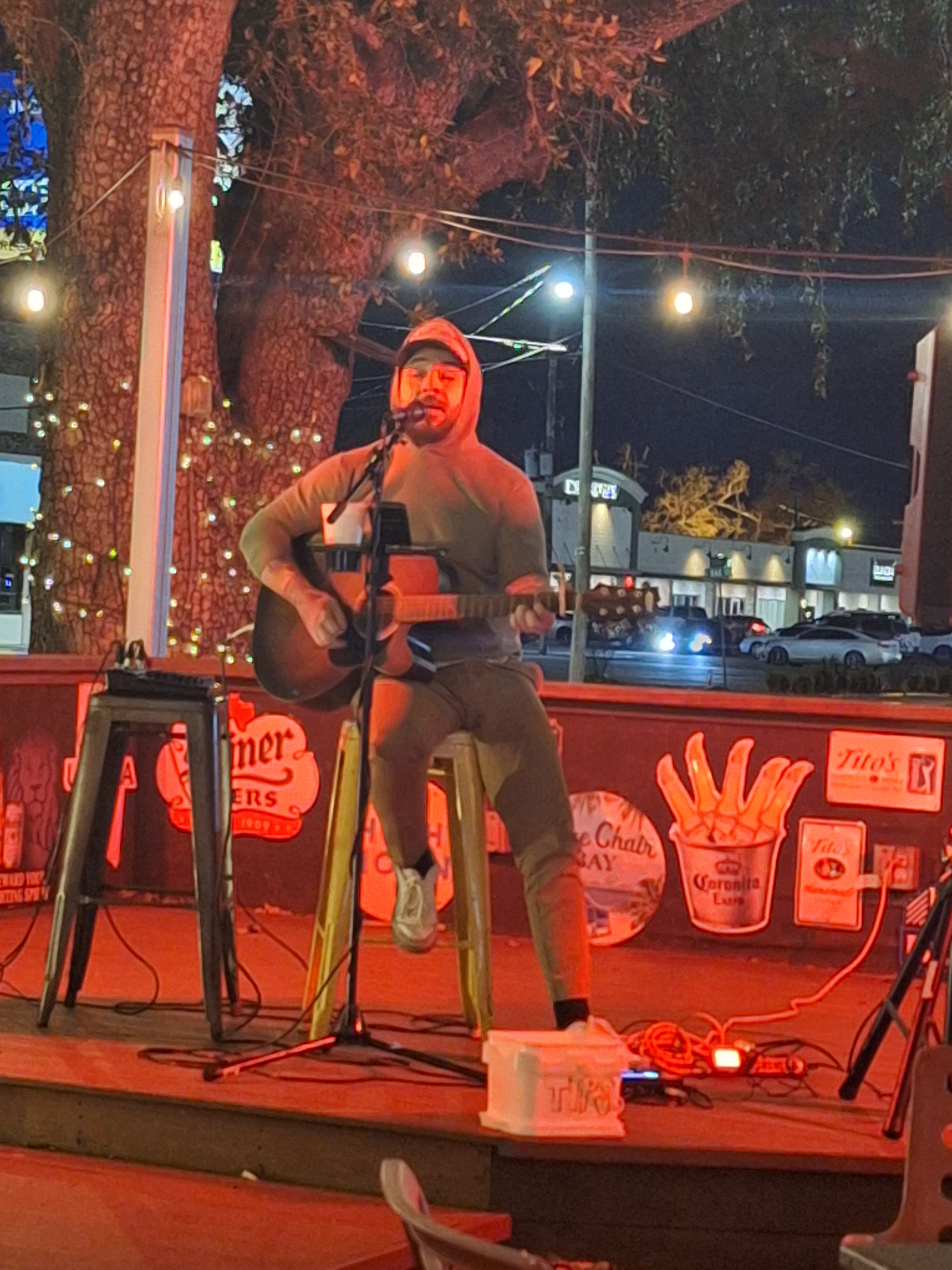 It was cold outside, where the stage is, so that’s why he’s bundled up. We sat beside an outdoor heater: