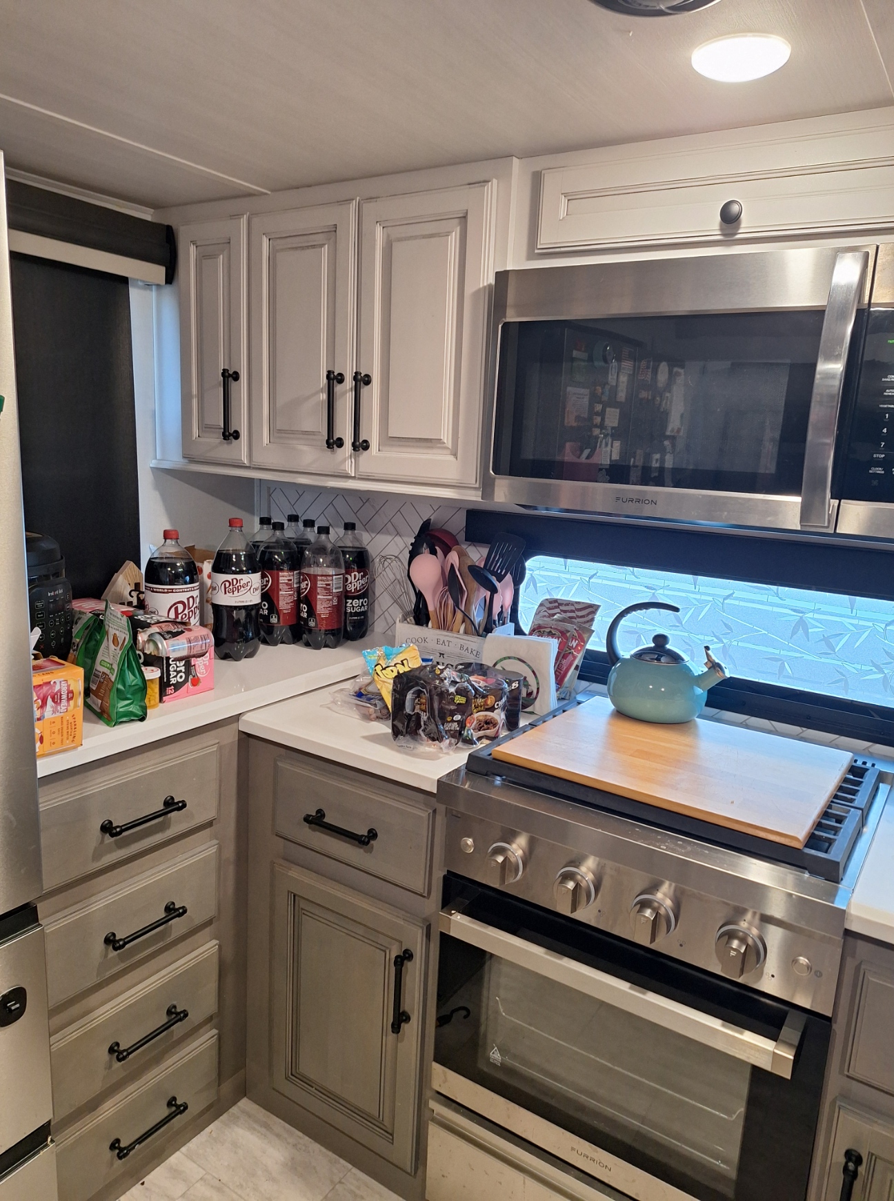 Next is the stove, microwave/convection oven, and the cabinets between the fridge and gas stove. Yes, my husband is addicted to Diet Dr. Pepper (he likes the Zero Sugar one best). In fact, his blood likely is at least 50% soda…I’m just sayin’.
