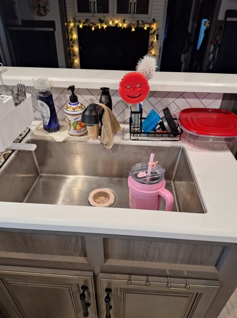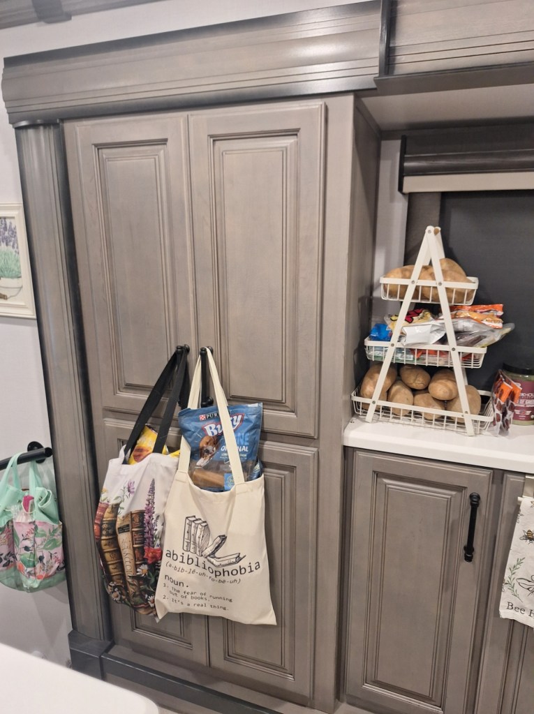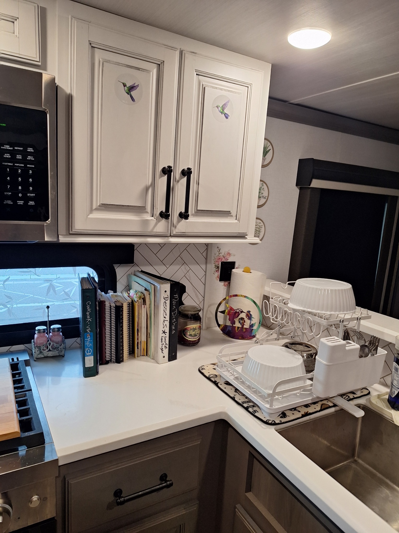 I mentioned in my last post that I love the kitchen in this RV because it’s larger than the average RV kitchen. That is possible because it’s in the back end. I love mine. These photos were taken right after grocery shopping, so some things are on the counters that are not always there, just for a few days after the shopping trip.