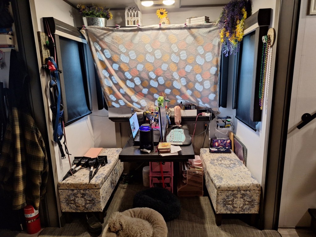 My work area came with four chairs. However, we wanted the benches for additional storage. Normally, there is a blind on that window, not a blanket, but in the theme ‘everything will break on a moving object,’ one of the holders did just that. We are trying to find a replacement for it.