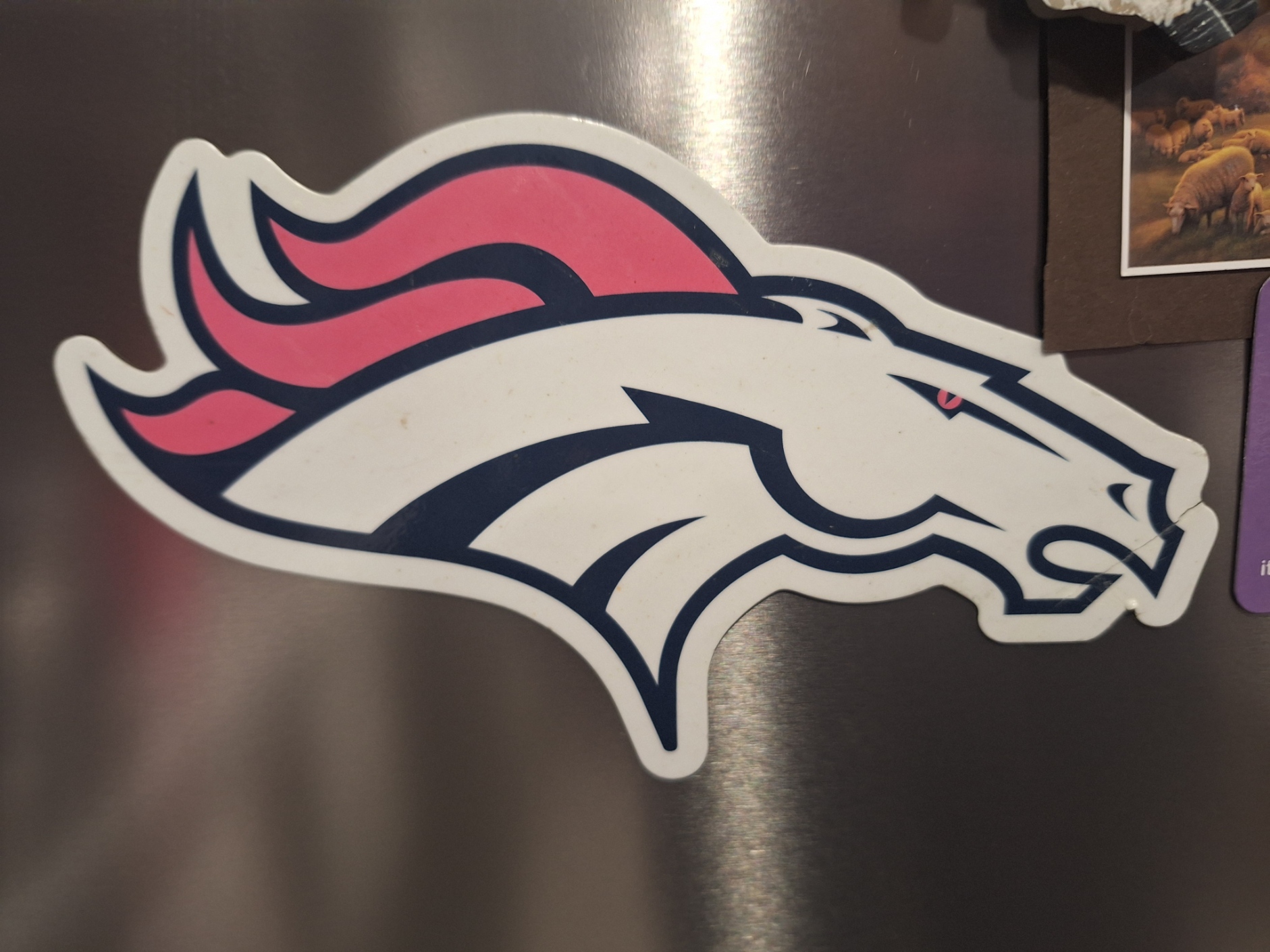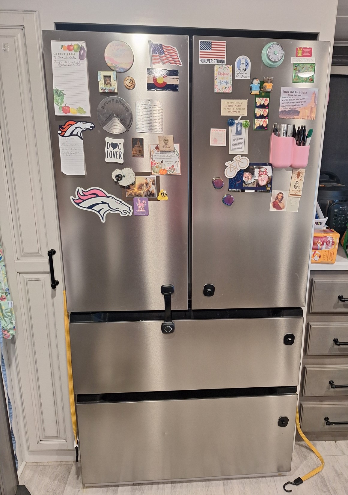This is a commercial refrigerator, which means it can have some issues in an RV, but I like it anyway. We have child locks on the doors, but we still have to use those yellow bungee cords to keep the darn thing closed! And the plastic door shelves have broken. Every. Single. One. So we stopped replacing them. We have one left. On the left is the tiny broom closet. I’m happy we have one for my mop, broom, grabber (you know, the old people grabbers you can buy), and other cleaning items. Notice the Denver Broncos magnets? Yeah, once a Broncos fan, always a Broncos fan. That’s an American football team for those who are unaware.