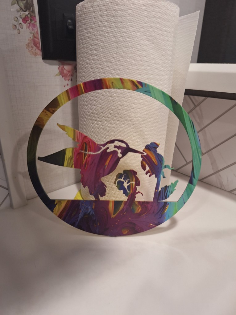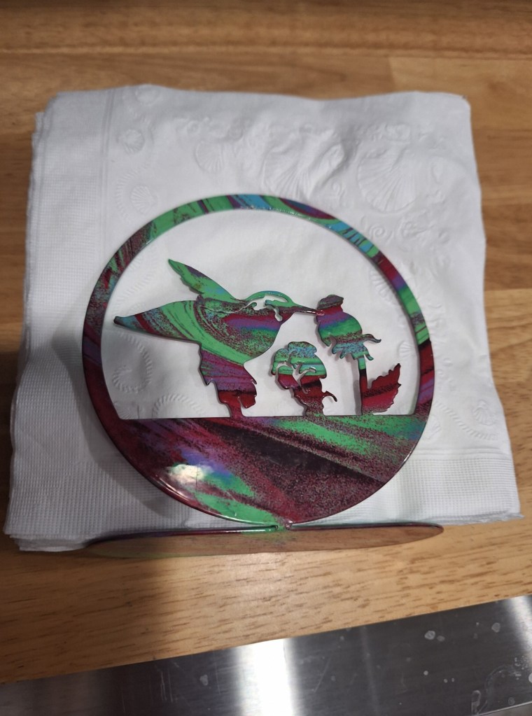 I love my cabinet color combo, too. That cottage white on top is right up my alley. The same color is used in both bathrooms. Yep, two bathrooms. That’s for later. On the other side of the stove is another cabinet area where I keep my cookbooks, my PINK salt and pepper shakers, and the paper towel holder our child bought me for Christmas several years ago, along with a beautiful napkin holder. Both feature hummingbirds.
