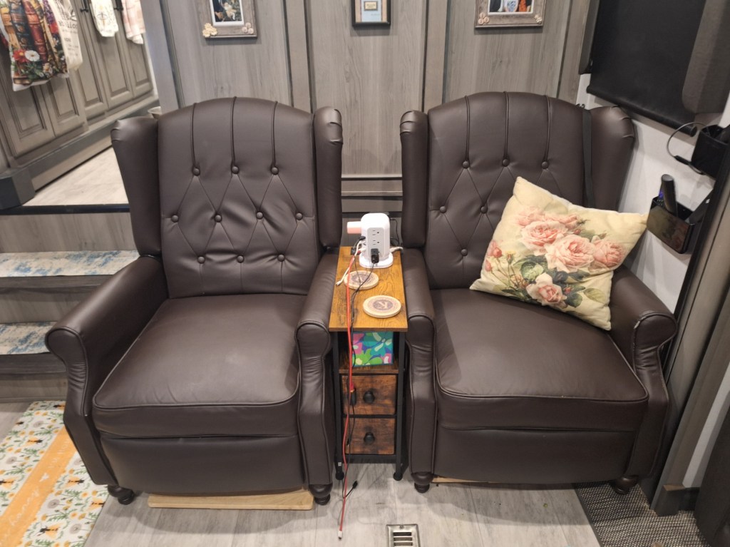 We replaced the chairs that came with the RV within a couple of months. They were a mess – not lined up, glitchy recliners. And we bought the little table between them (with the tower of power there). These chairs recline, have heat, and massage. We love them!