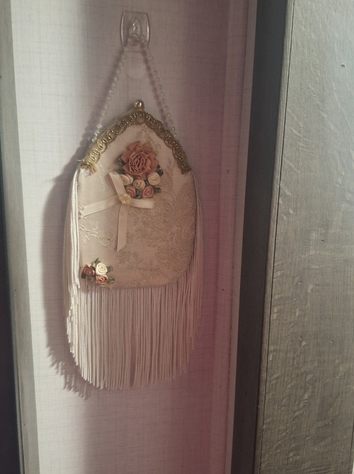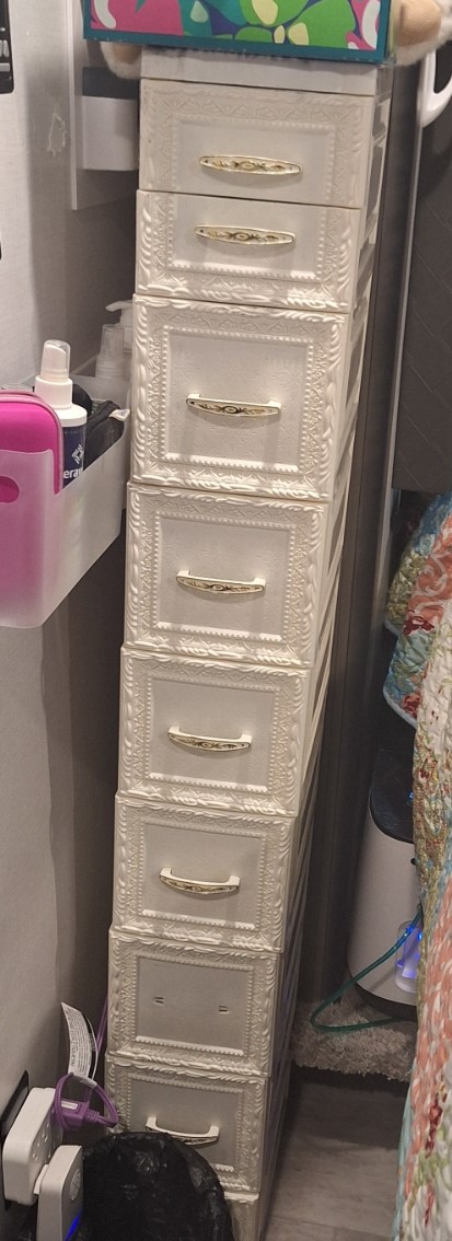 Here’s the dresser I mentioned. The items in this picture are on it permanently – except the bear (he heats up for sore muscles) and the holder on the right, courtesy of Quake Hold. The cabinet is also shallow and has three shelves. Some of the decor items were gifts from my best friend of fifty years, Laurie, who passed away on July 30th last year. I still miss her terribly. One item was my mother’s and one was a gift from my father. Laurie also made this, which hangs in our bedroom: