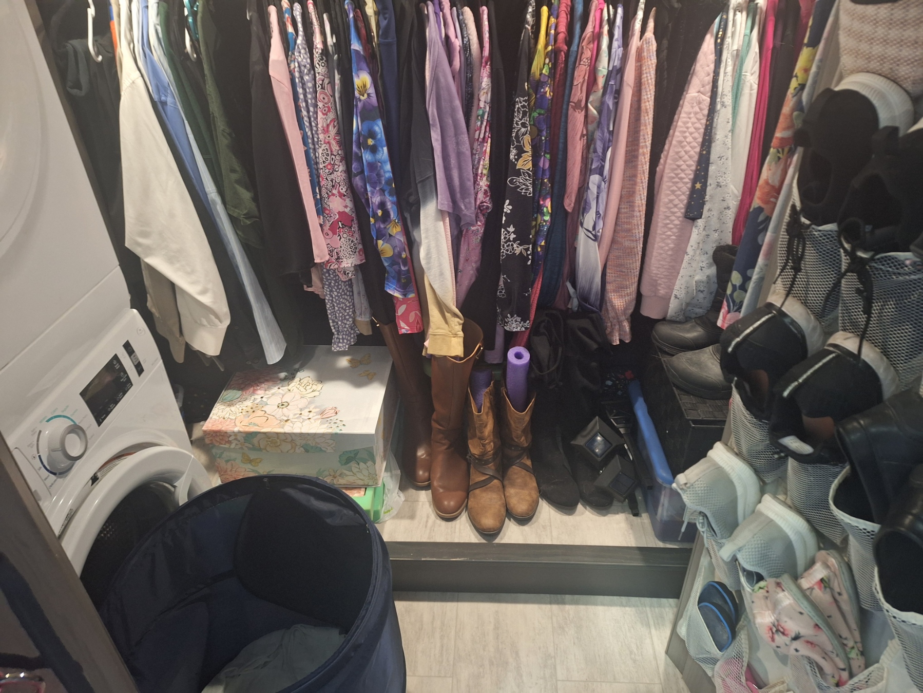 Our living area is in the middle of our RV. We have a rear kitchen, which I like because it separates the rooms and is larger than average for an RV kitchen. And our bedroom and main bathroom are at the front of the RV. We also have a ‘walk-in’ closet. Don’t get excited. It’s a cramped area with a small pathway to step into when putting things away. I think I may have finally successfully organized it. The floor is still a little messy! But settling in takes a bit of time. So here are a couple of photos. And yes, I do still have too many shoes…