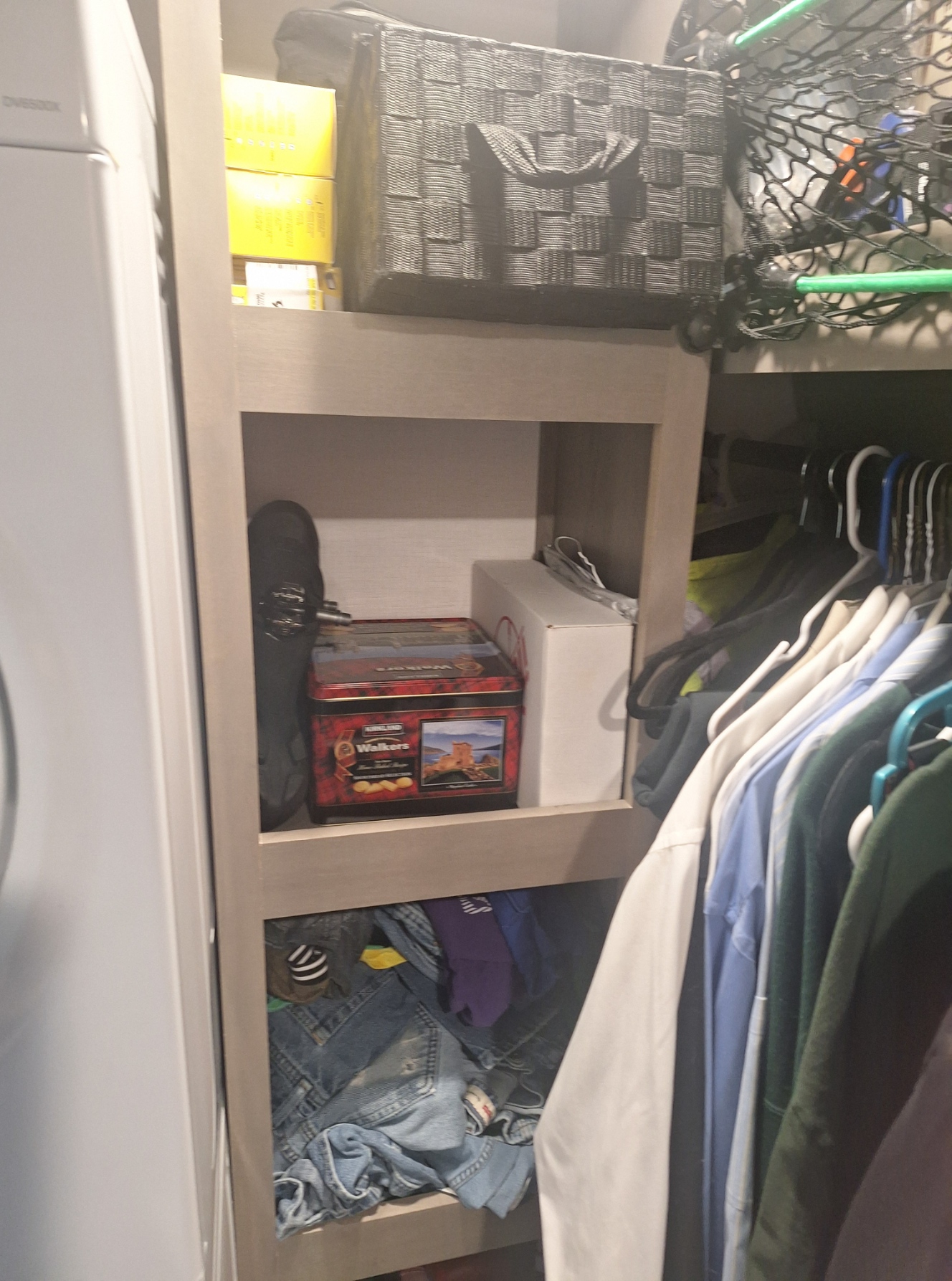 On each side of the closet are cubbies. They are needed because the dresser appears large, but the drawers are short and shallow. We use the cubbies for jeans, sweaters, and some shirts. Okay, on Jay’s side, one shelf gets to have the sewing kit, a laser target practice, and his bike shoes. I mean, come on! He doesn’t need the space I do. No man does, right?