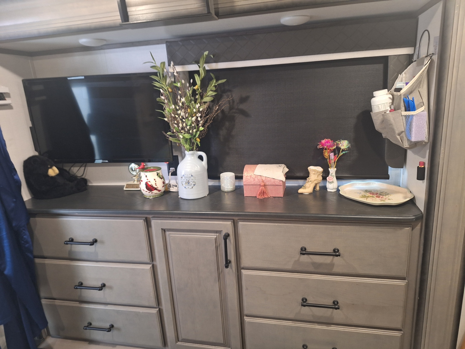 My side has my dog plaque (I adore our boy, Tristan, and can’t imagine life without him), a little plaque that says: “You will forever be my always,” and the wood pieces. Yep, one is crooked. Things shake A LOT in an RV.