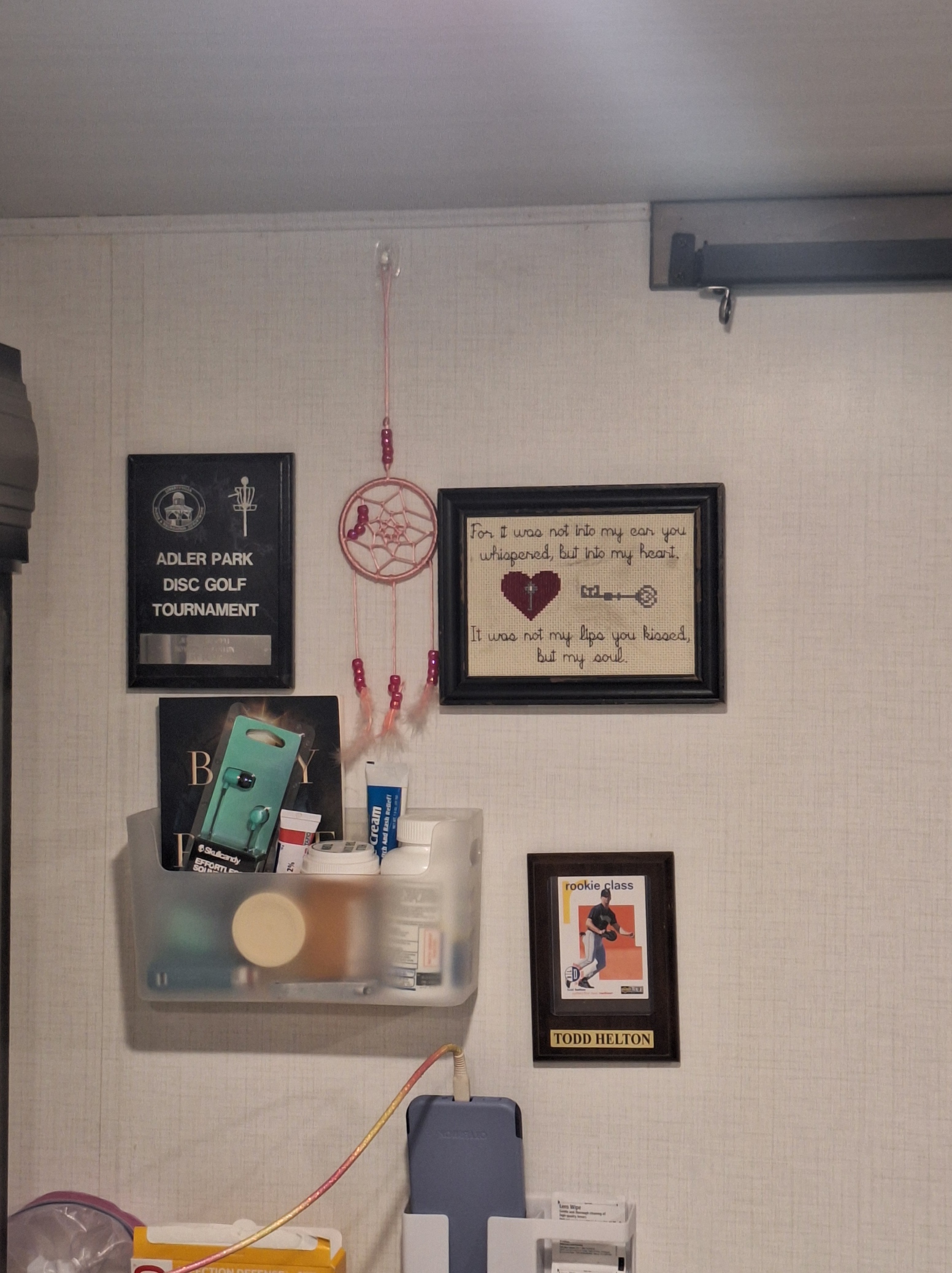 Jay’s side (the embroidered frame features a quote I found that says: “For it was not into my ear you whispered, but my heart. It was not my lips you kissed, but my soul.”) and his Rockies Baseball Playing Card for Todd Helton, along with a plaque for a disc golf tournament.
