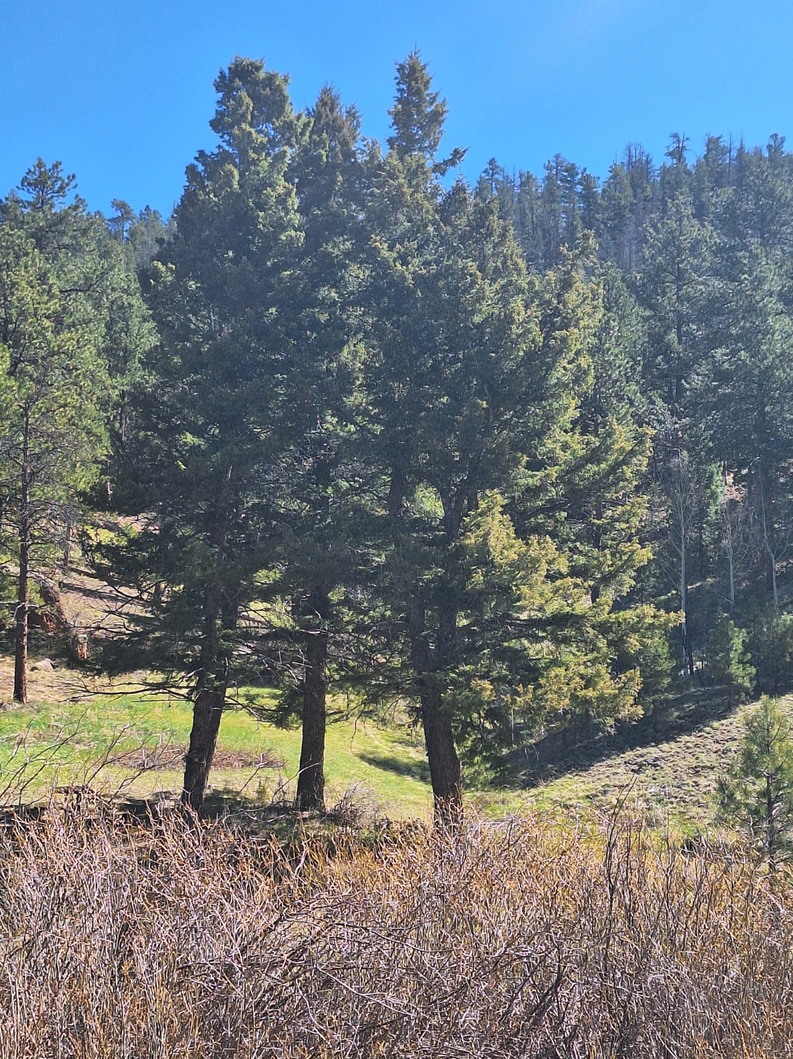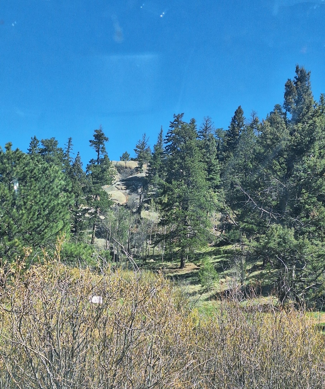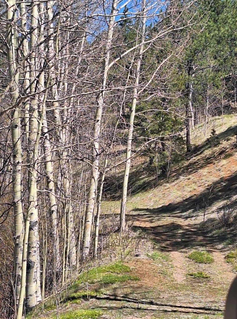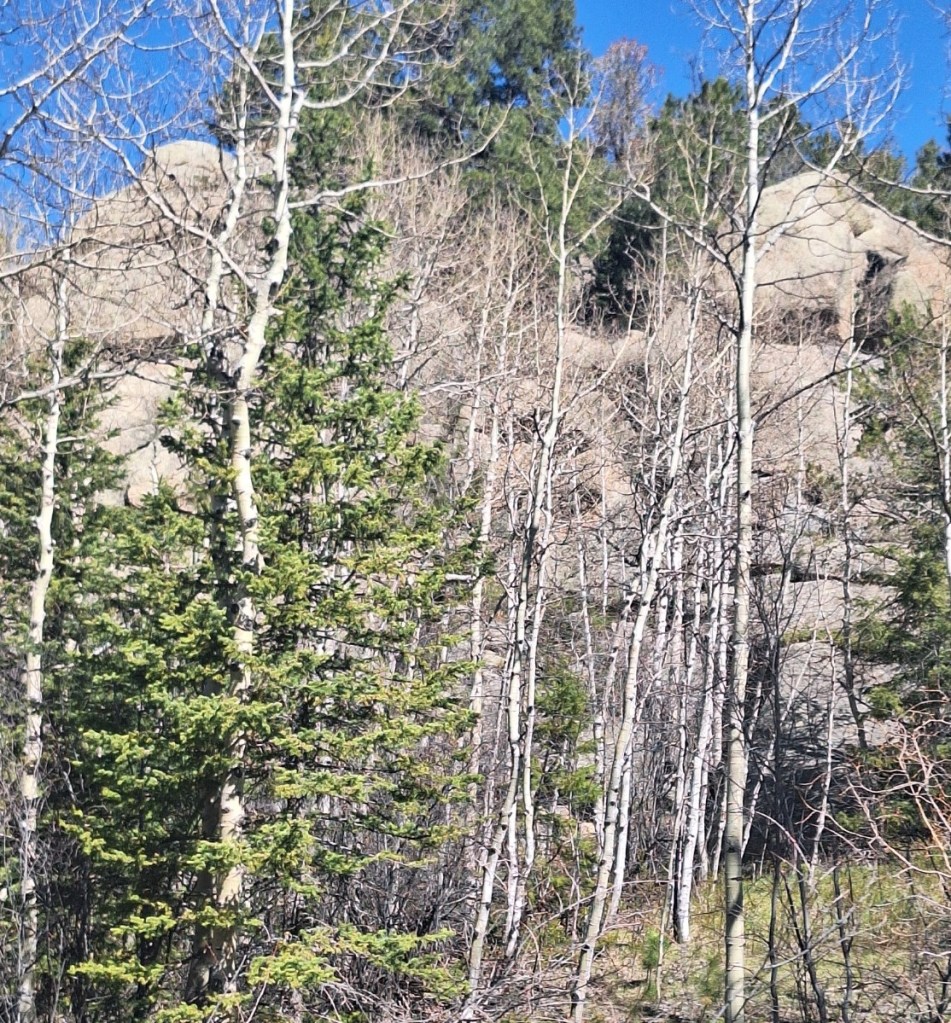 These woods are filled with pine and fir trees, Aspen, which wasn’t blooming yet, and wildlife, of which we saw only one thing. That will be toward the end of this post. I wish I could convey the smell of these trees, the sound of the wind blowing like waves through the tops, and how green they remain all year long. I wish I could share the feeling in my heart and the peace in my soul, when I find myself in these mountains.