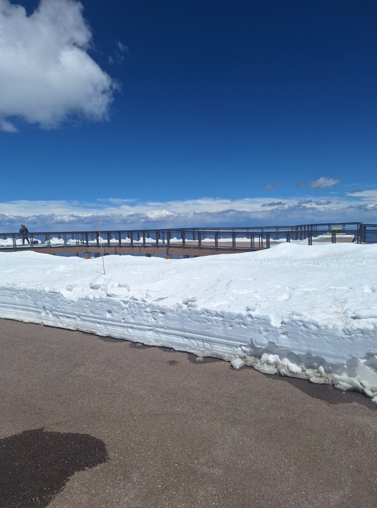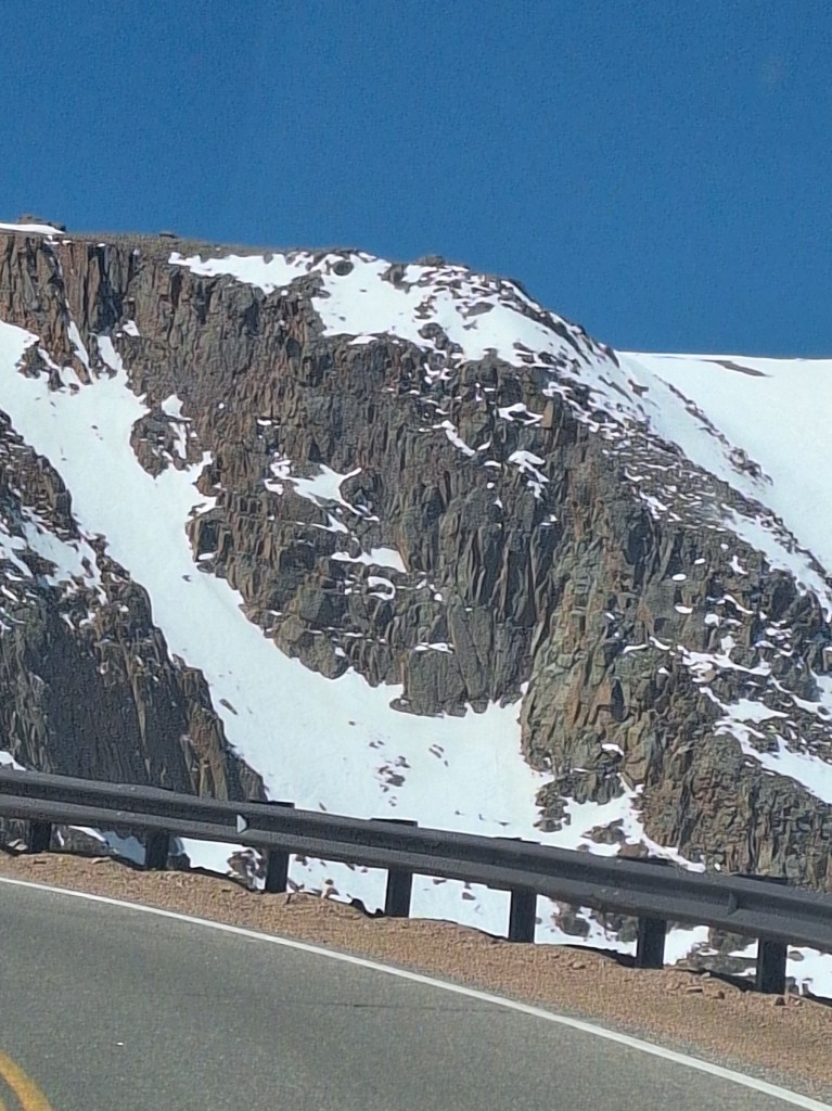 Back to reality…or something I can verify, anyway. Pikes Peak is 14,100 feet above sea level. It is very cold and still very snowy there. For me, it’s also hard to breathe. I don’t think I’ve mentioned it, but on Christmas Eve in 2015, I was hospitalized for respiratory failure caused by staph pneumonia, and was also septic. Sepsis kills many people every year. They told my husband they didn’t know if I would live. And the intubation tube they used was too large for my throat, causing permanent vocal cord paralysis. I lost my singing and professional speaking voice. Despite having surgery later to open up my breathing passageway to get me off full-time oxygen, I still have a smaller area to take in air than the average person. We purchased some canned oxygen in preparation for that. Still, once we hit 11,000 feet, I started getting sleepy. I took deep breaths and used as much of the oxygen as advised. But the instructions are for athletes who live in lower elevations and need oxygen when playing in higher elevations. Not for someone with my issue. So it didn’t help much. By the time we reached the summit, I could not stay awake, and Jay had to take the dogs out to walk them and to look around alone. I was sad, but it is what it is. Jay says I say that a lot – It is what it is. But that’s a fact. Once we headed down the mountain and passed 11,000 feet, I was awake and breathing fine.