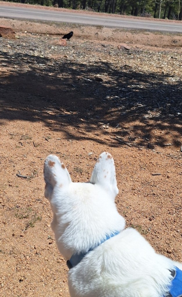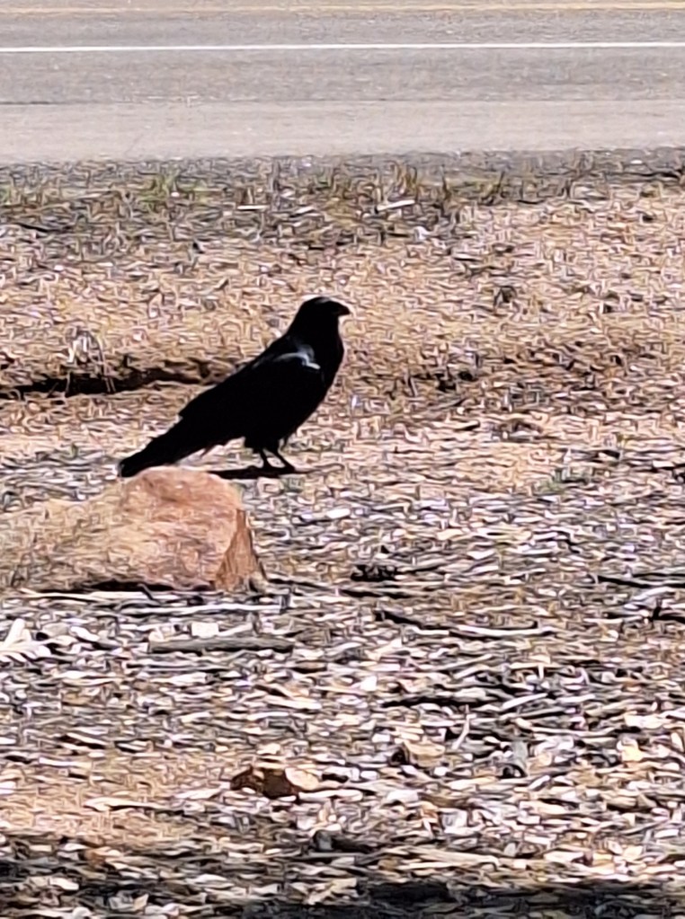 I thought it was a crow. He was big. The next day, I opened Facebook to find a comparison picture of a crow vs a raven. Although you can’t see the side of his beak here, it had the raven bump. Tristan spotted him first: