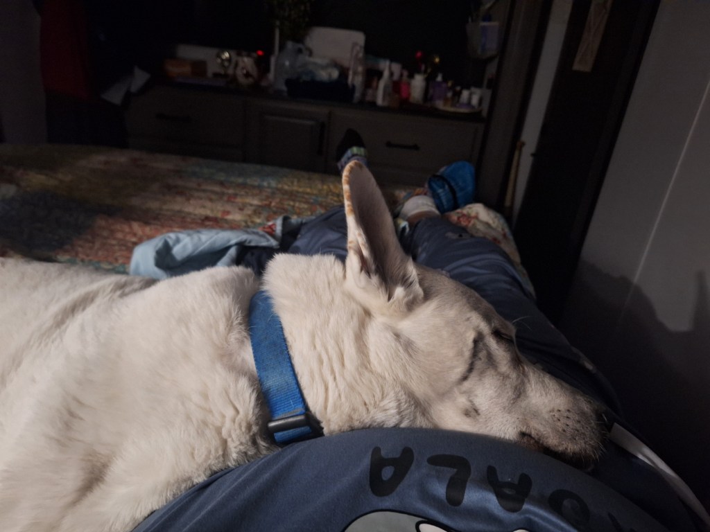 He keeps me warm, and we slept like this at least one third of the night. Yeah, I have an ice pack on my right foot. It’s been swelling due to an infection in a toe, and my “Orthowear” shoes, which force my feet to stay in alignment with my ankle. I’m having to wear different shoes for a while.