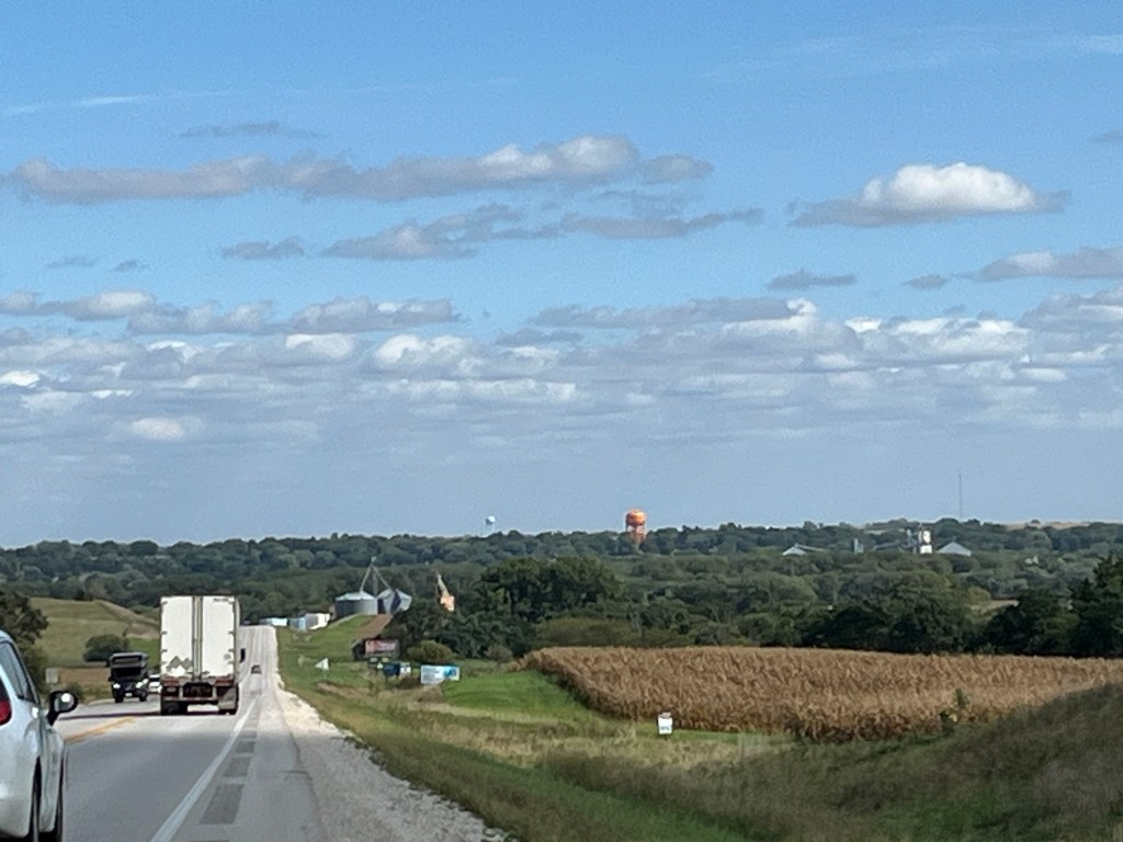 The sky, the green, an adequate shoulder to ride on! LOL. Things are looking up. Here, he approaches Red Oak, Iowa. Obviously, a small farming community, something Iowa has a great deal of: