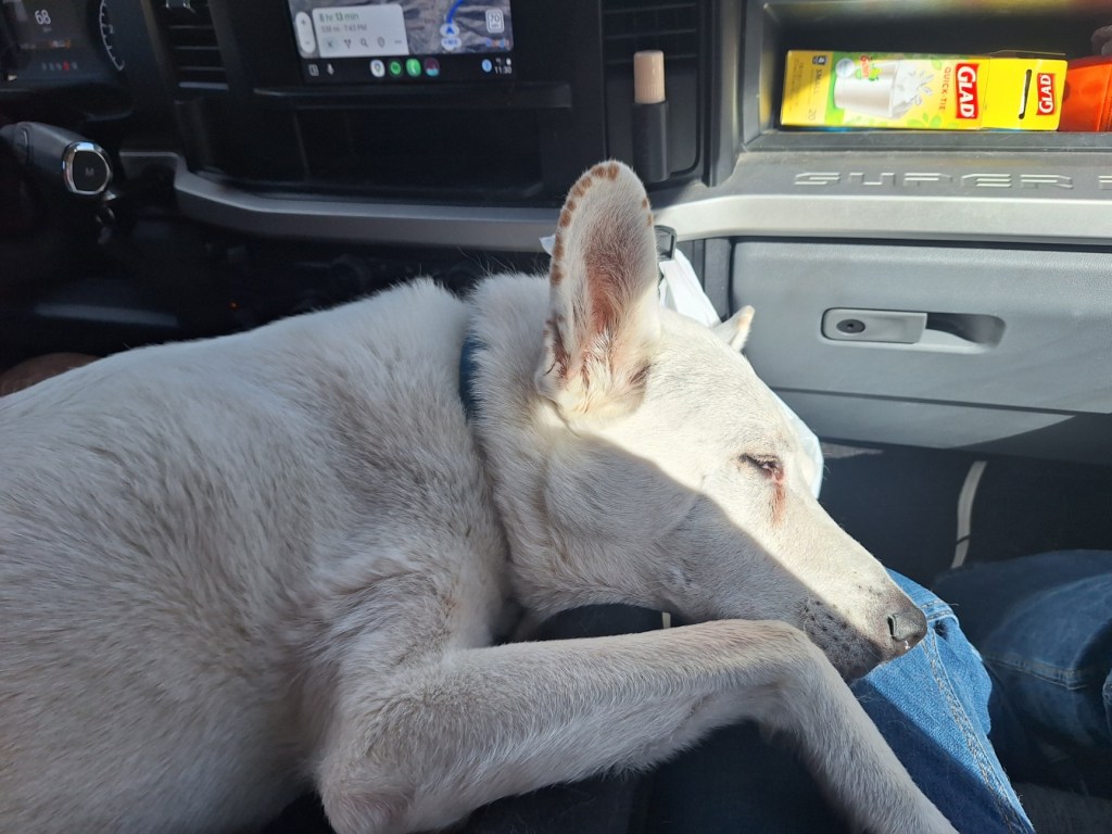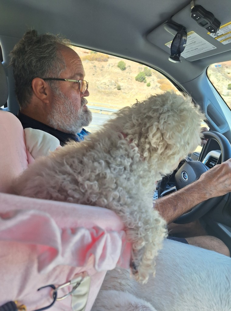 Our dogs travel pretty well. Here’s Tristan snoozing half on my lap and half in his dog bed: