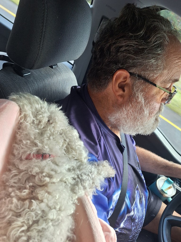This is how Sophie and Tristan traveled over the three days. First, part of Tristan is on my lap. The rest of his body is in his car seat: