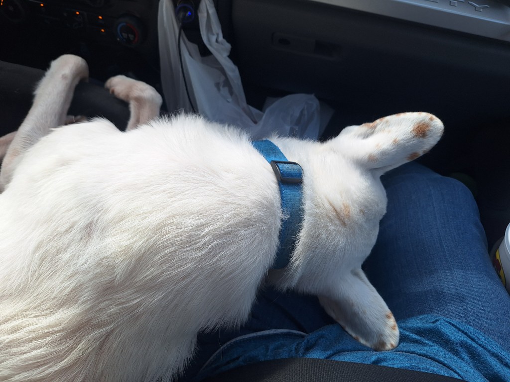 Sophie likes to ride with her paws on Daddy (Jay) and her head lying against his back while she sleeps. When she’s not in her car seat, she’s in my arms. She likes to cuddle in the car, but I think she’s happiest in her little car seat: