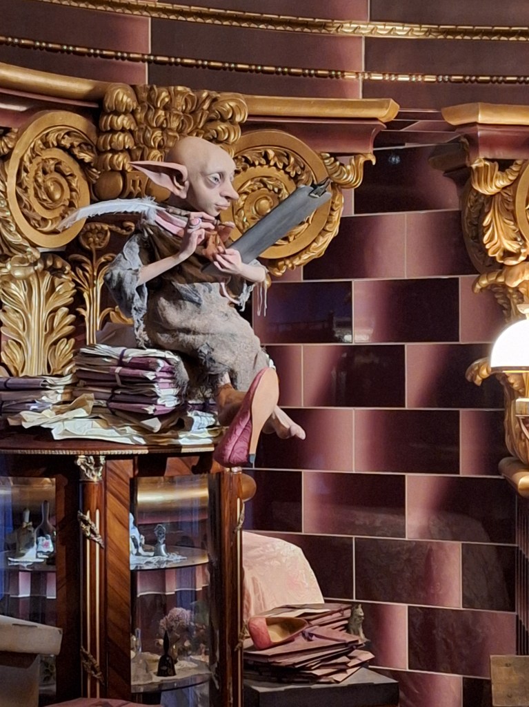 There was one of Mad Eye Moody, too, but it must not have turned out. He was talking to another portrait. Next were items Delores stole from Muggle-borns, and the little elf was taking an accounting of them. Notice he has on one of her pink shoes. The other had fallen off and was on the chair. He was talking to us as we passed, telling us all about it: