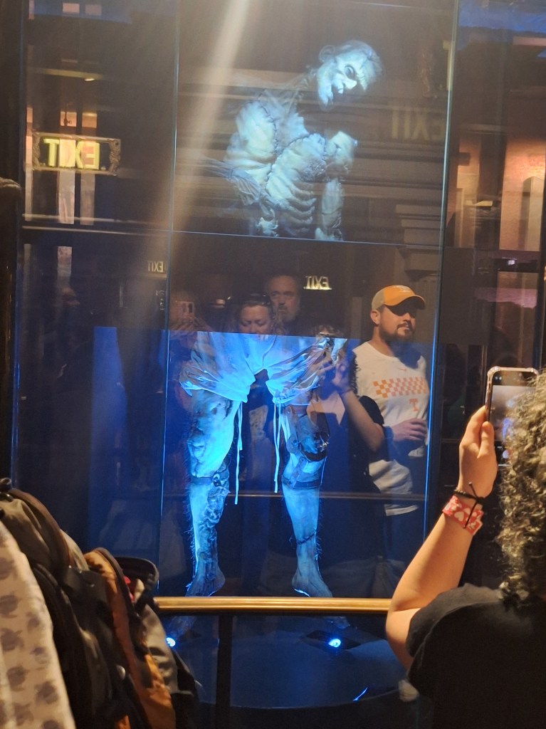 We rode Monsters Unchained: The Frankenstein Experiment. It features animatronic Frankenstein’s monster, Dr. Victoria Frankenstein, and some angry monsters revolting. Lots of things to see in line, of course. That’s part of the fun. Frank (I don’t know what his name was in the movies, aside from Frankenstein’s monster), being prepared: