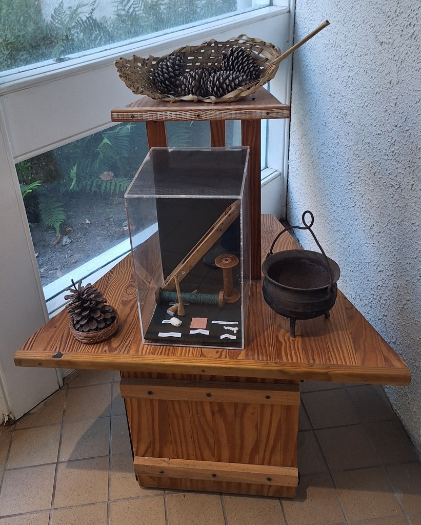 At the end of the pathway was a museum that we toured. Some items were replicas, and some were dug from archeological sites on the property. A replica spinning wheel: