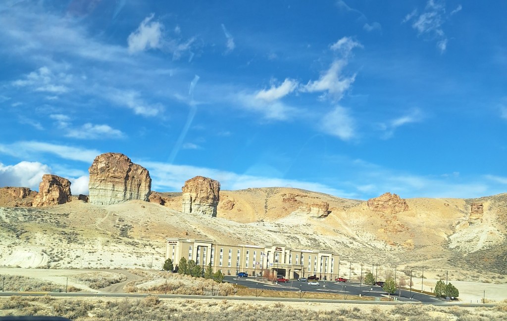 In the middle of nowhere, you approach this hotel. I can’t recall if it’s a Hilton or a Holiday Inn, but it almost blends in with the scenery and is a good ten miles outside of Green River, Wyoming. It’s location seems odd to me: