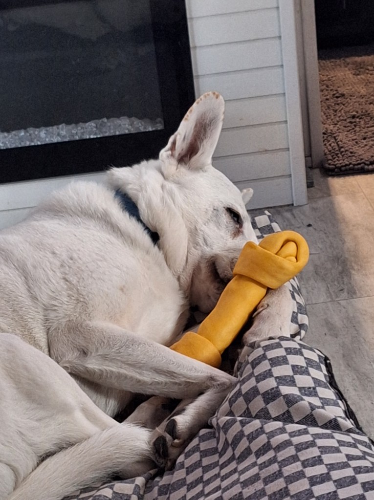 I thought I’d share some photos of our sweet boy, Tristan. Here he sleeps with his bone securely held in place. You know, just in case Dad or I want to steal it from him…: