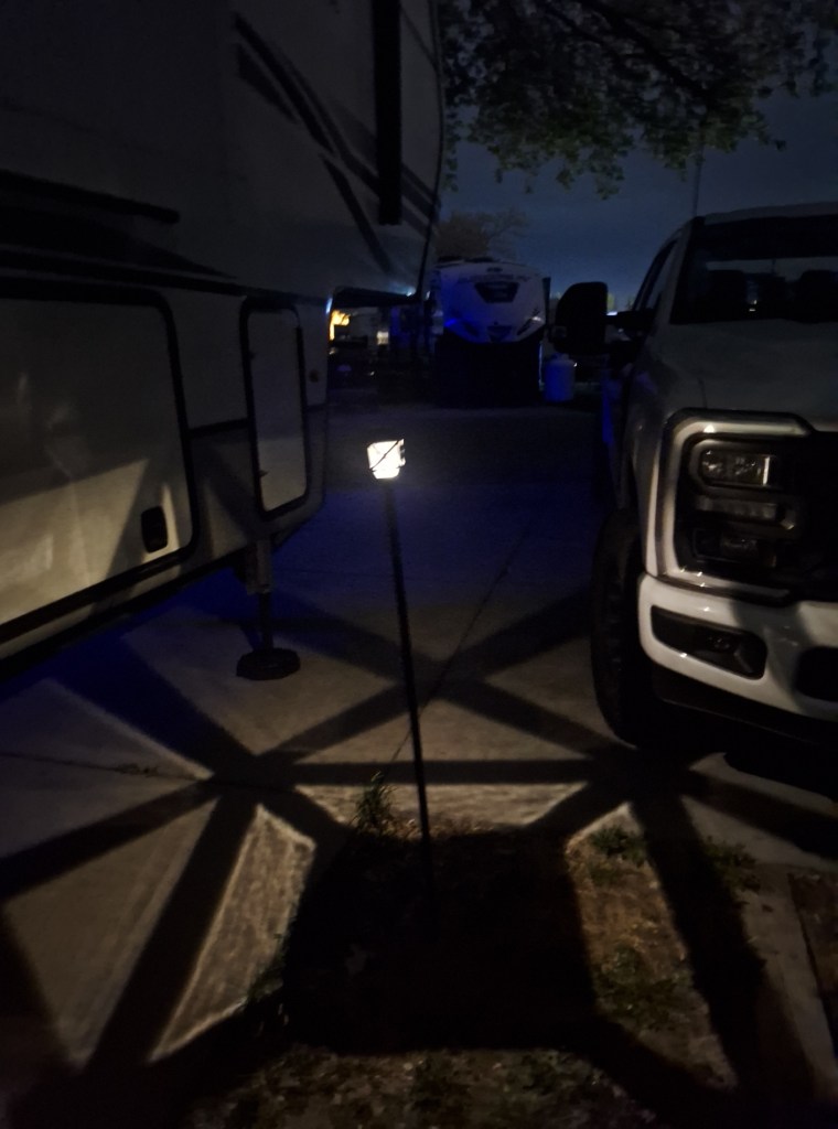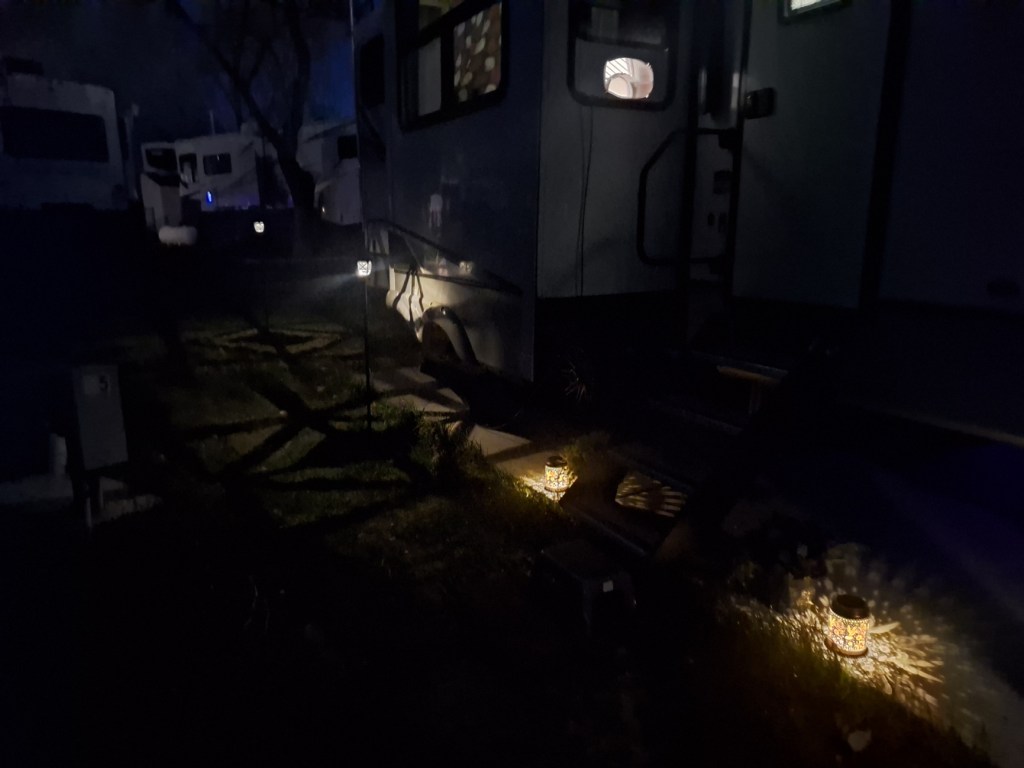 There isn’t a lot you can do outside an RV, especially when you’re on the move. But it’s nice to make an area you’ll be in for a while look like home. Recently, I grabbed some broom/mop sticks from Dollar Tree and brought them home to make lanterns from lights I’ve had for a long time. Jay prepared them, and we put three of the four outside. I love how they look, though they do little to nothing to light things up! This photo shows two of the lights in the background and the two hummingbird lights I purchased a year or so ago: