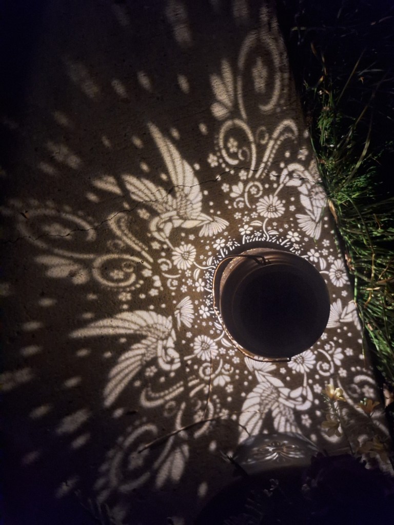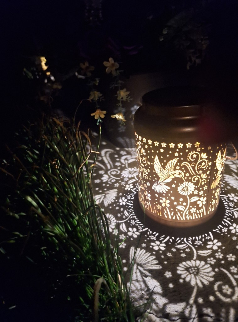 I’m night blind, even after cataract surgery, so I couldn’t move much outside because I can barely see! Here is a close-up of my beautiful Hummingbird Lanterns: