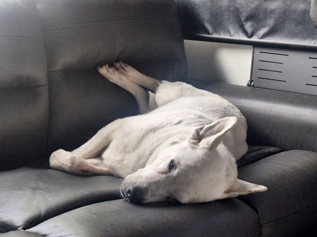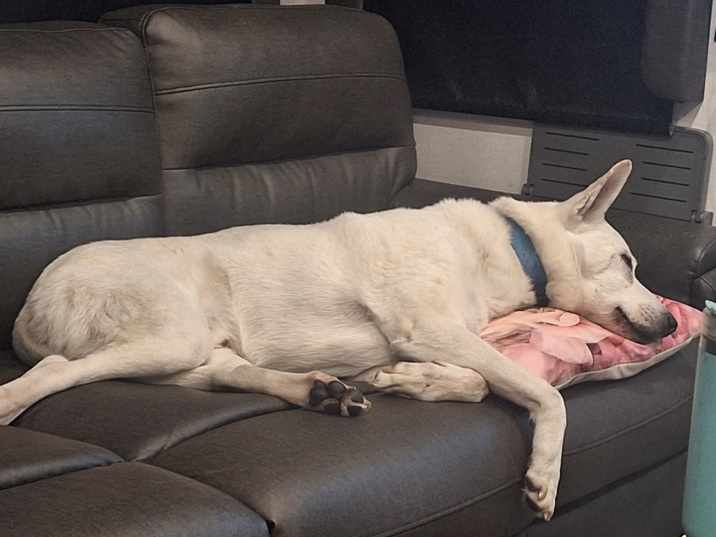 He’s owning it on the sofa now that he’s the only dog in the household: